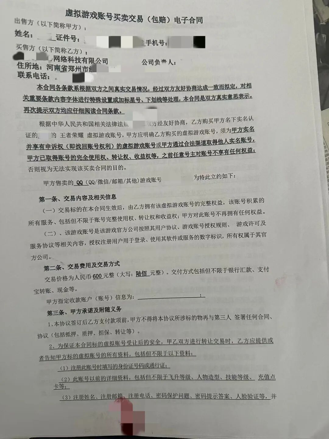 唐某将自己的游戏账号以600元价格卖出